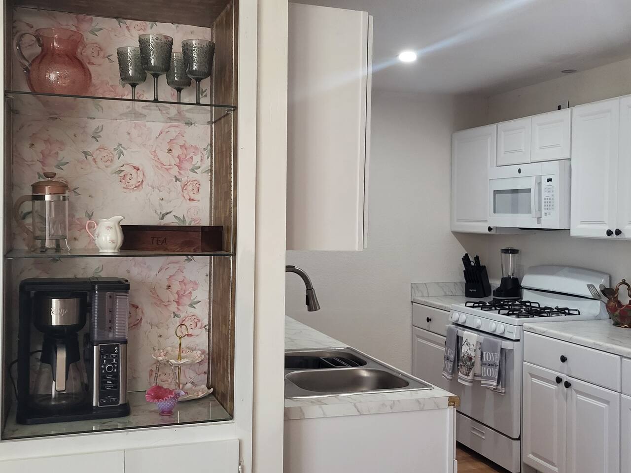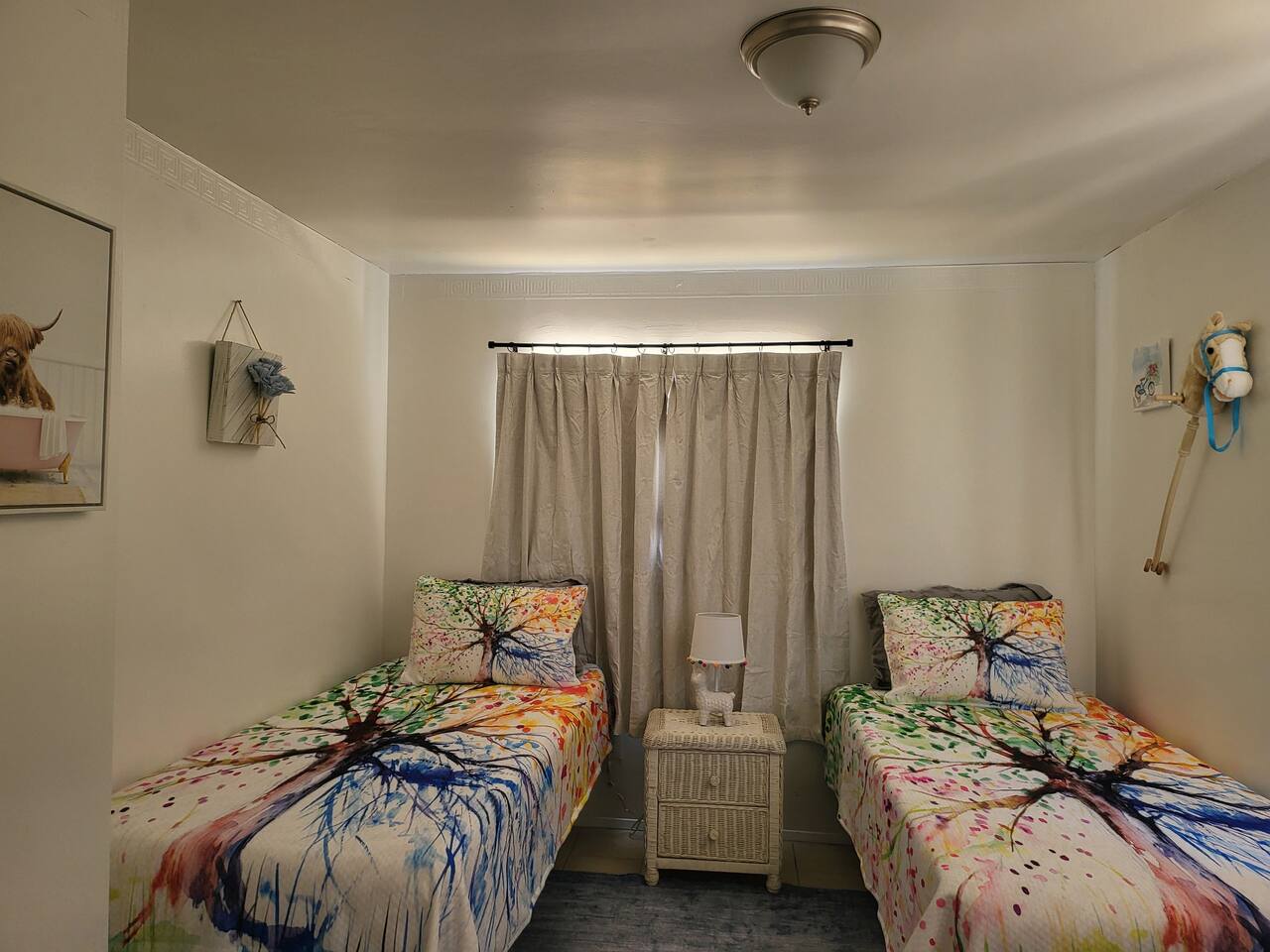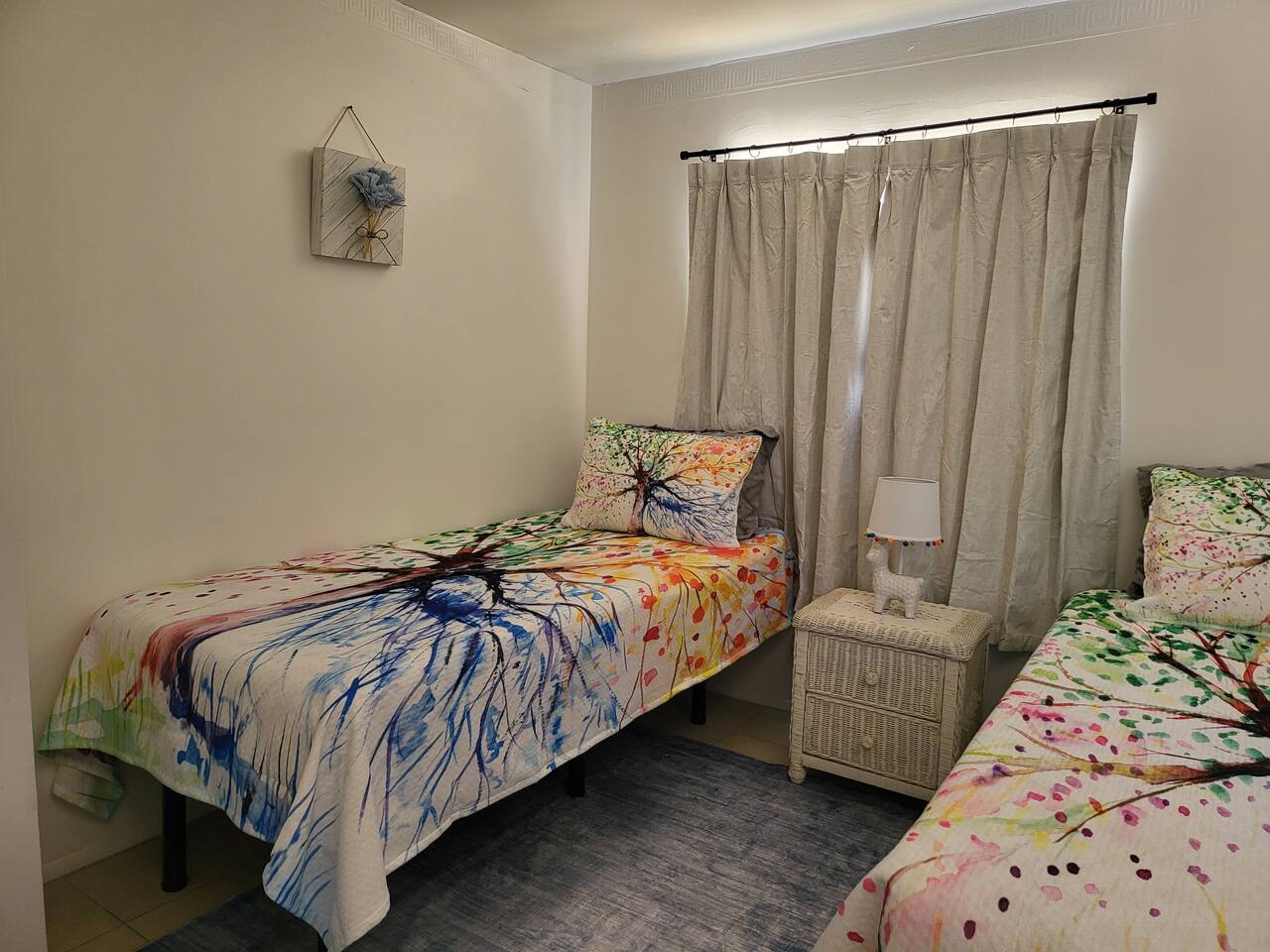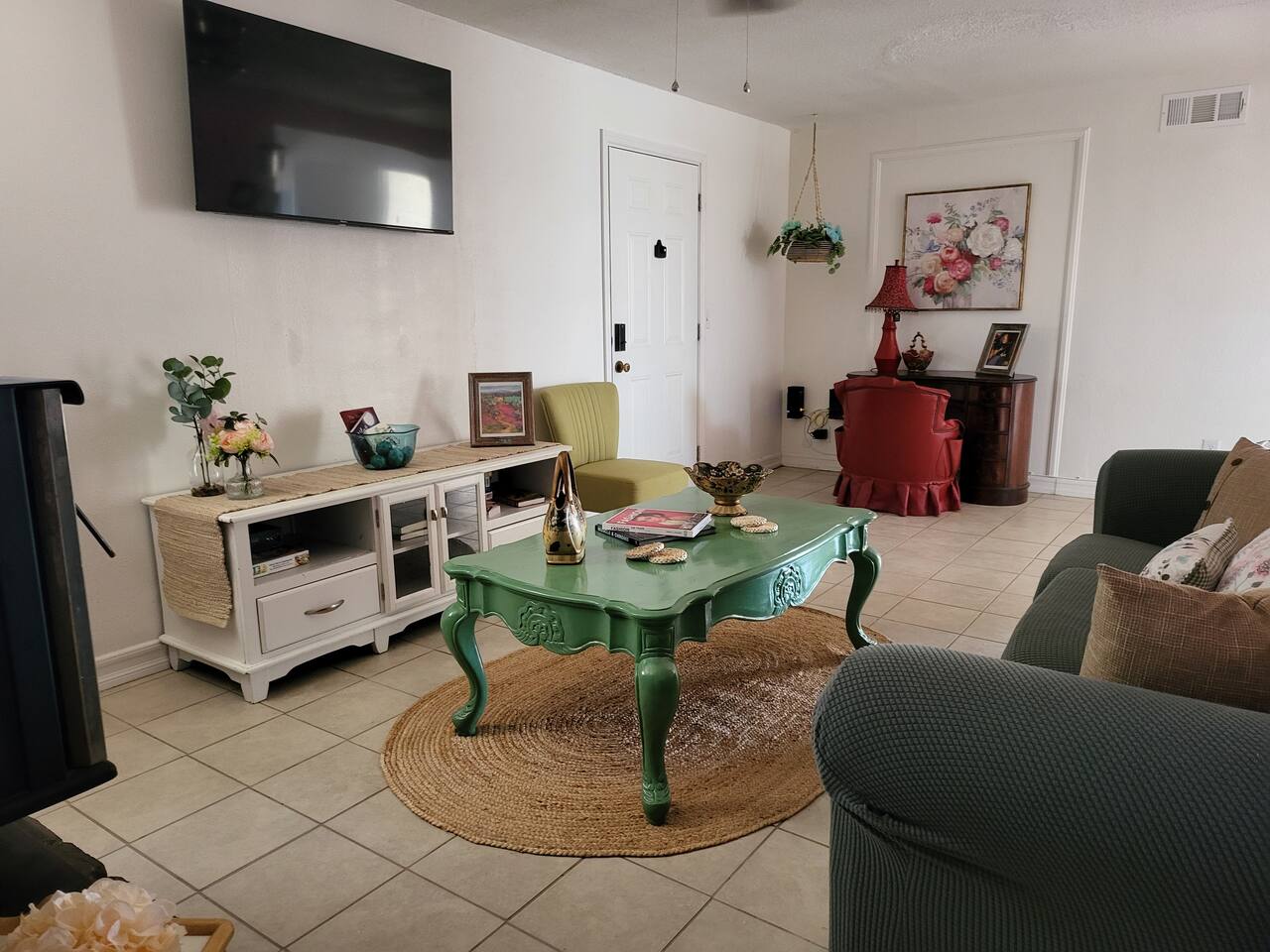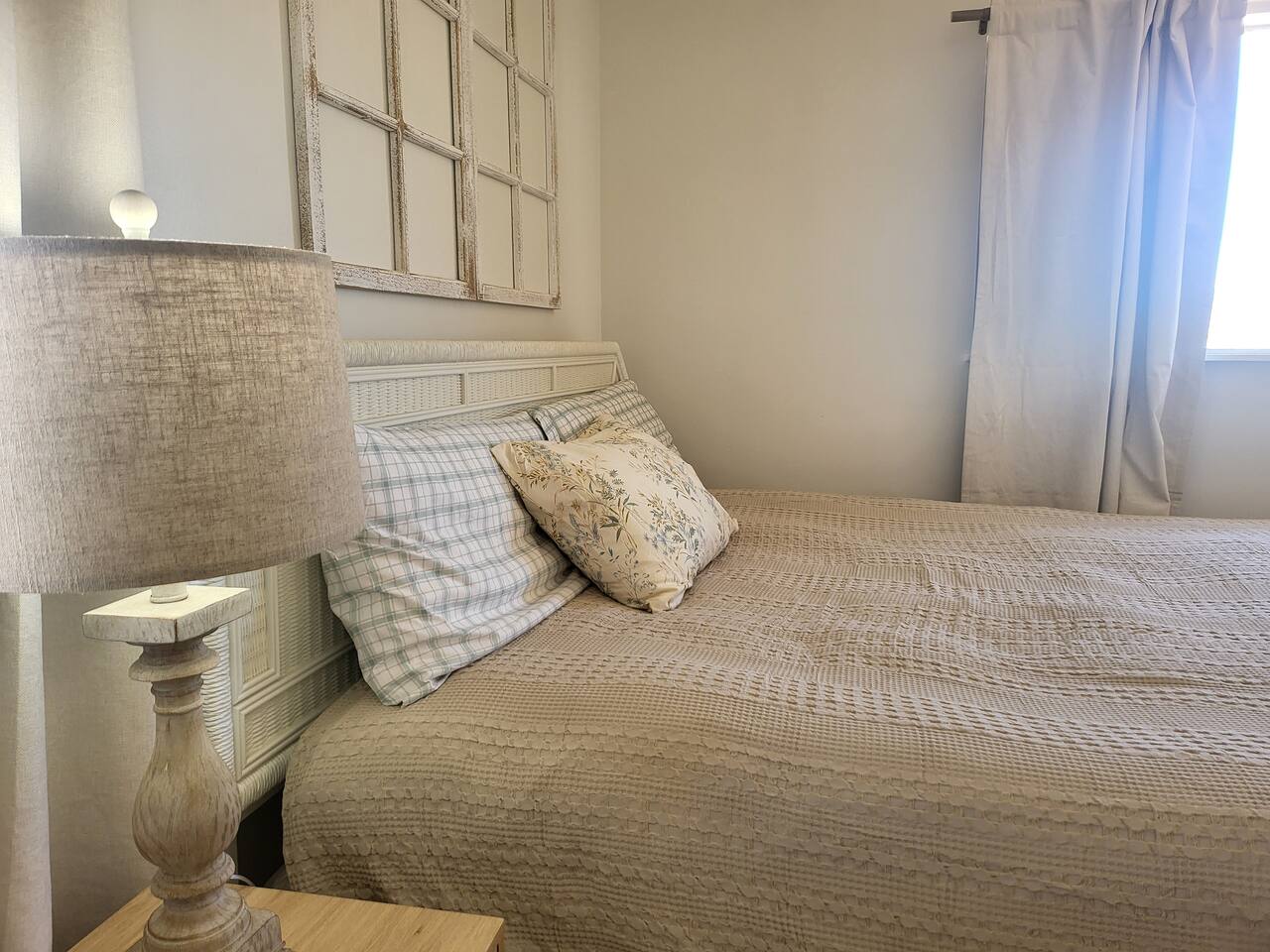 This cute shabby chic apartment has two bedrooms and sleeps 5 comfortably. Bedroom One has a king bed, blackout curtains, a smart TV, dresser, and bedside tables with lamps. The lamps have charging ports for your electronics so you do not have to hunt for an outlet. Bedroom two has two twin beds, Blackout curtains, a Smart TV, dresser, and kids toys. You will find a smart TV, comfy couch, desk with lamp and chair in the living room. The kitchen is fully equipped and the coffee and tea are free.