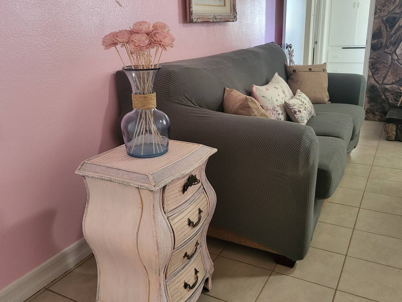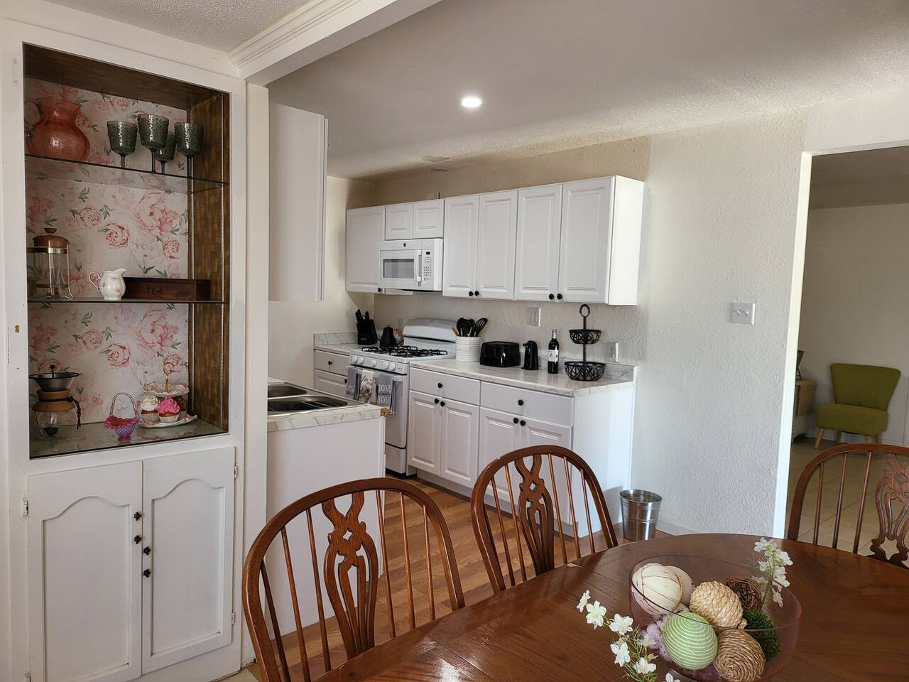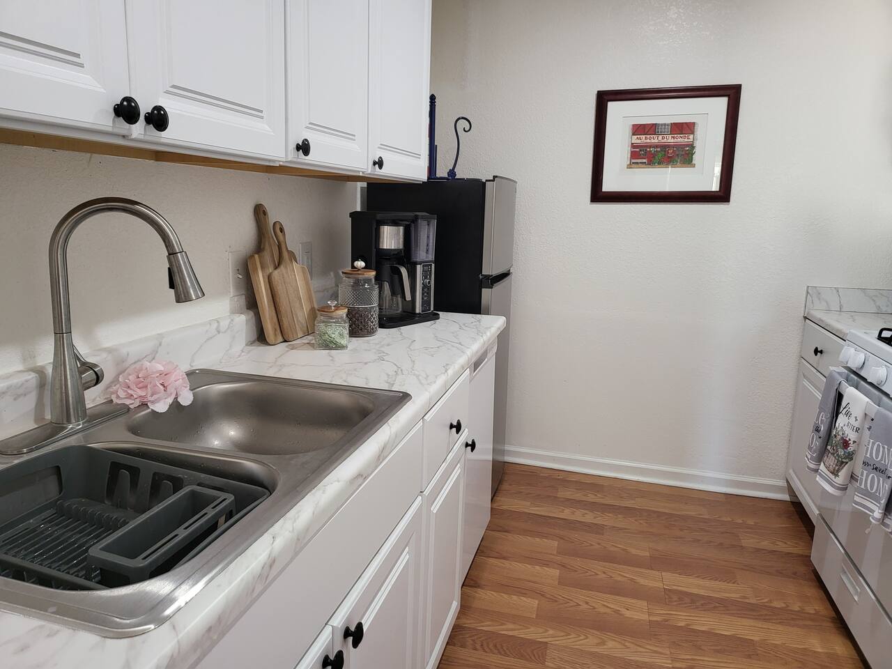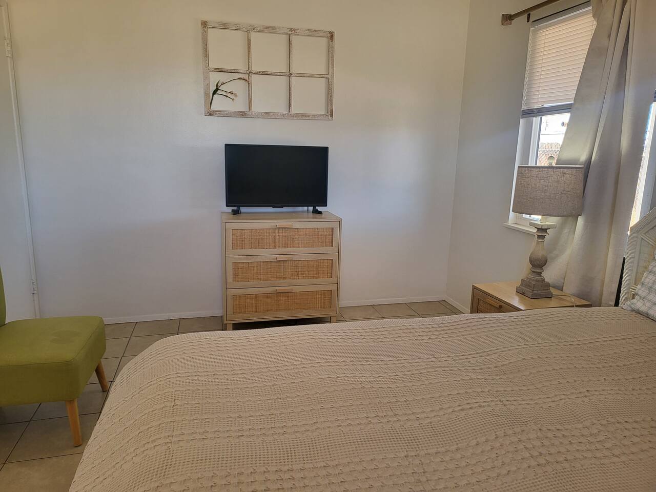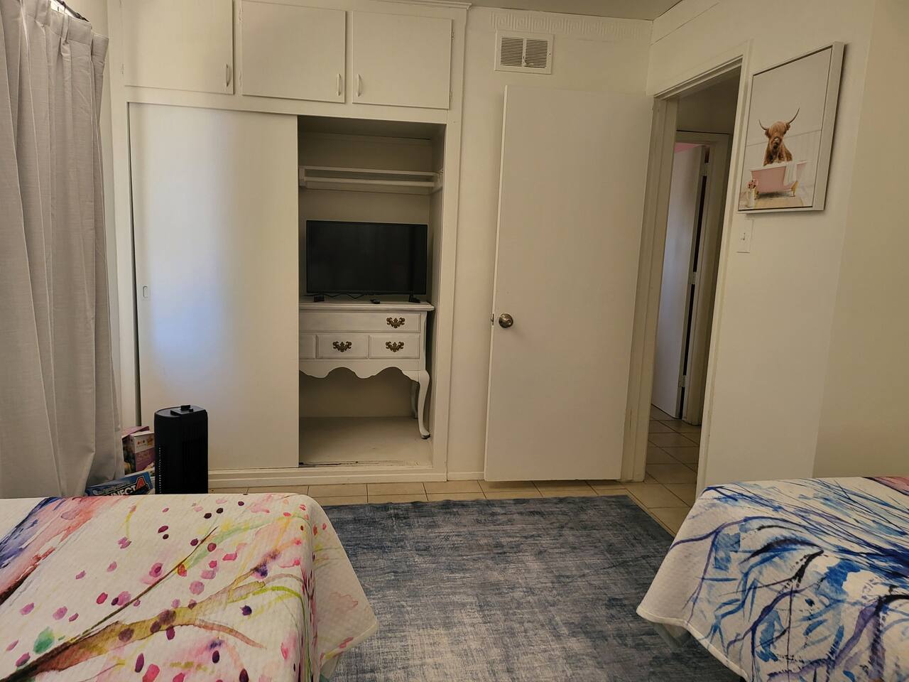 This cute shabby chic apartment has two bedrooms and sleeps 5 comfortably. Bedroom One has a king bed, blackout curtains, a smart TV, dresser, and bedside tables with lamps. The lamps have charging ports for your electronics so you do not have to hunt for an outlet. Bedroom two has two twin beds, Blackout curtains, a Smart TV, dresser, and kids toys. You will find a smart TV, comfy couch, desk with lamp and chair in the living room. The kitchen is fully equipped and the coffee and tea are free.