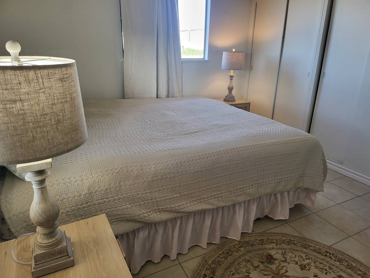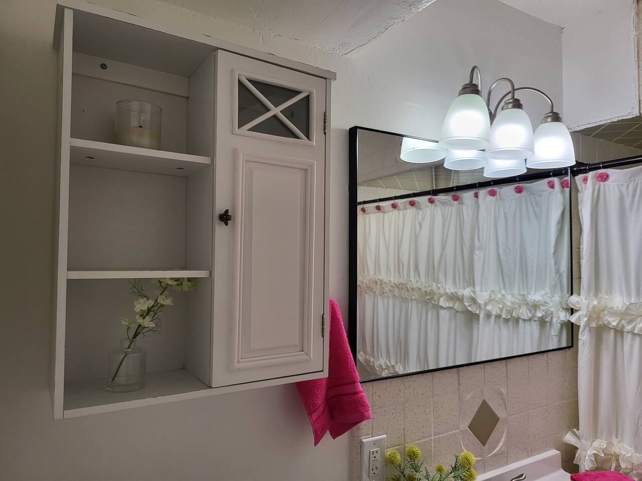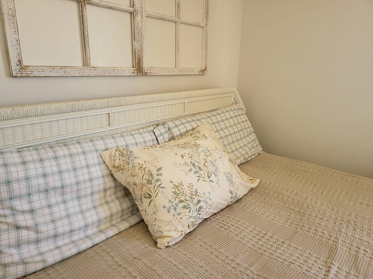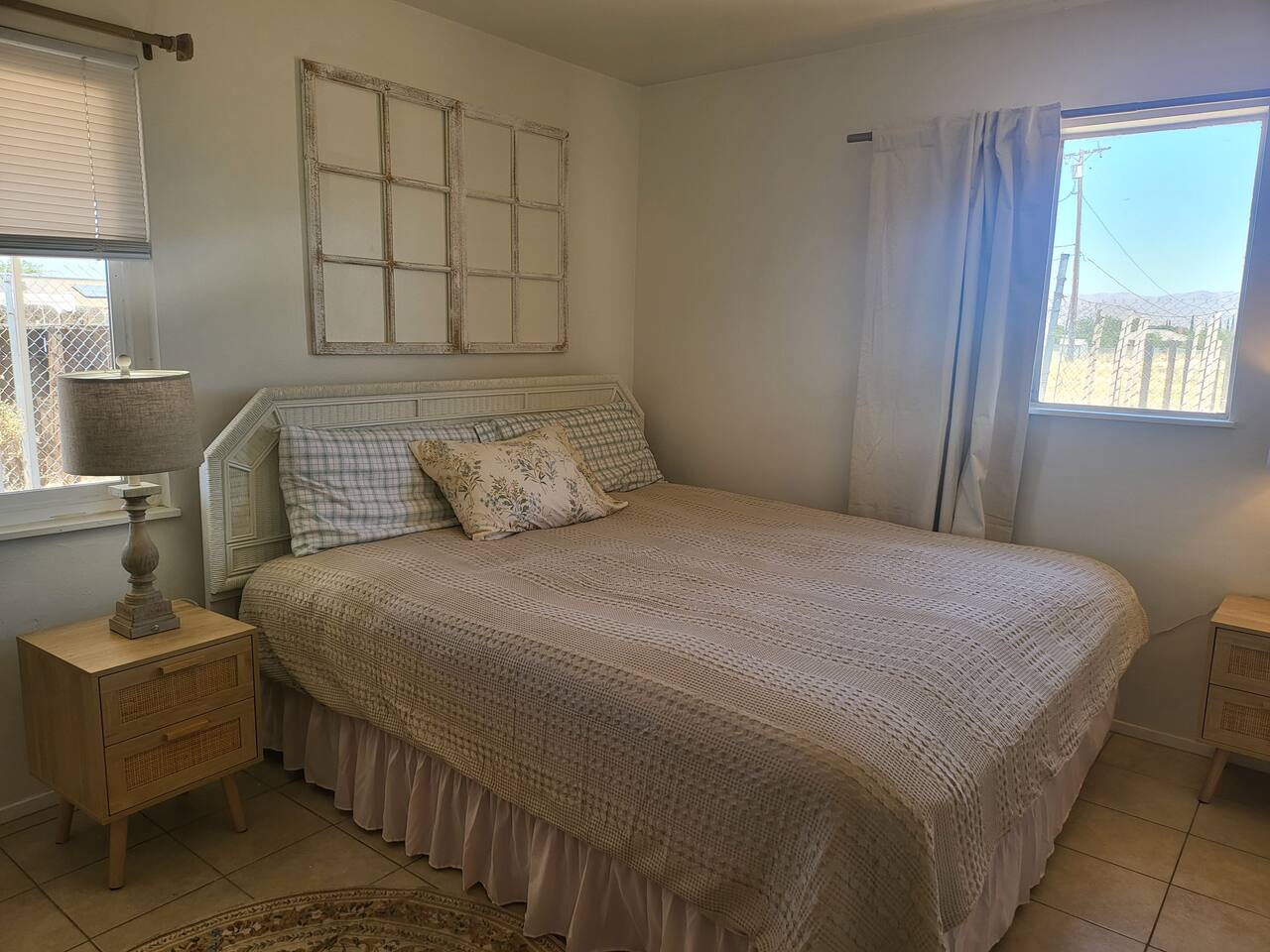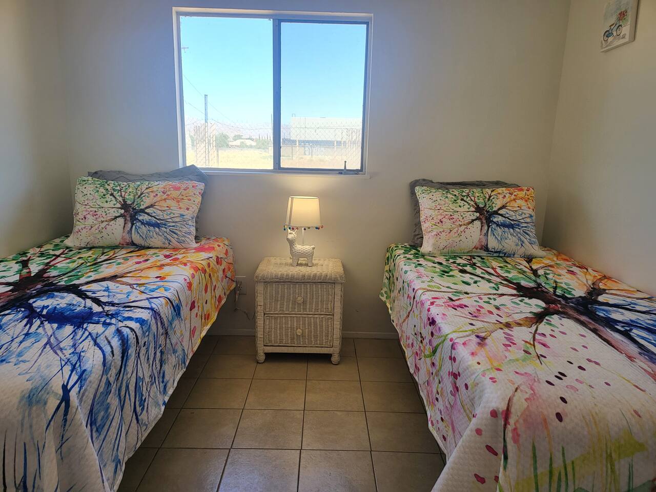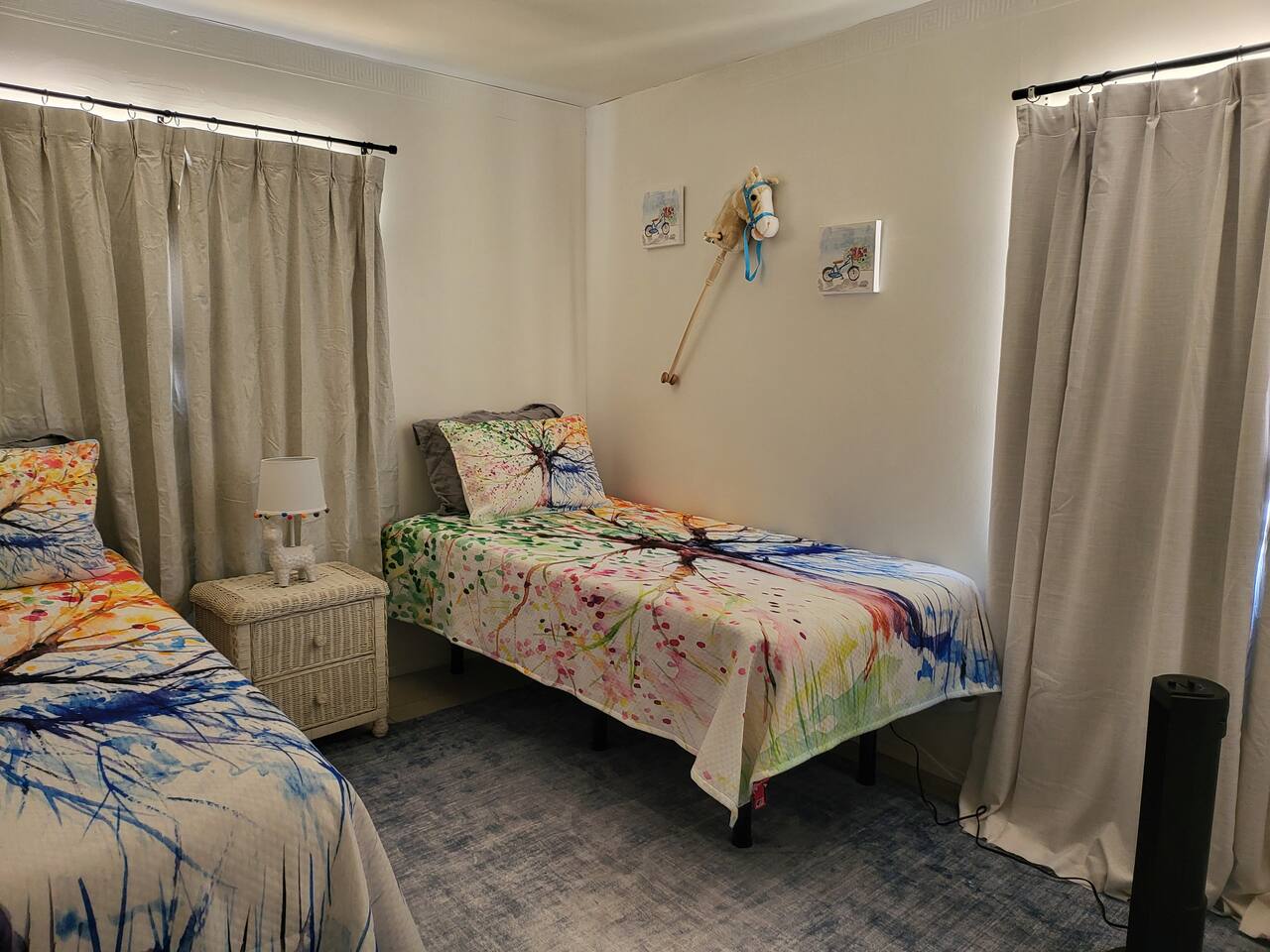 This cute shabby chic apartment has two bedrooms and sleeps 5 comfortably. Bedroom One has a king bed, blackout curtains, a smart TV, dresser, and bedside tables with lamps. The lamps have charging ports for your electronics so you do not have to hunt for an outlet. Bedroom two has two twin beds, Blackout curtains, a Smart TV, dresser, and kids toys. You will find a smart TV, comfy couch, desk with lamp and chair in the living room. The kitchen is fully equipped and the coffee and tea are free.
