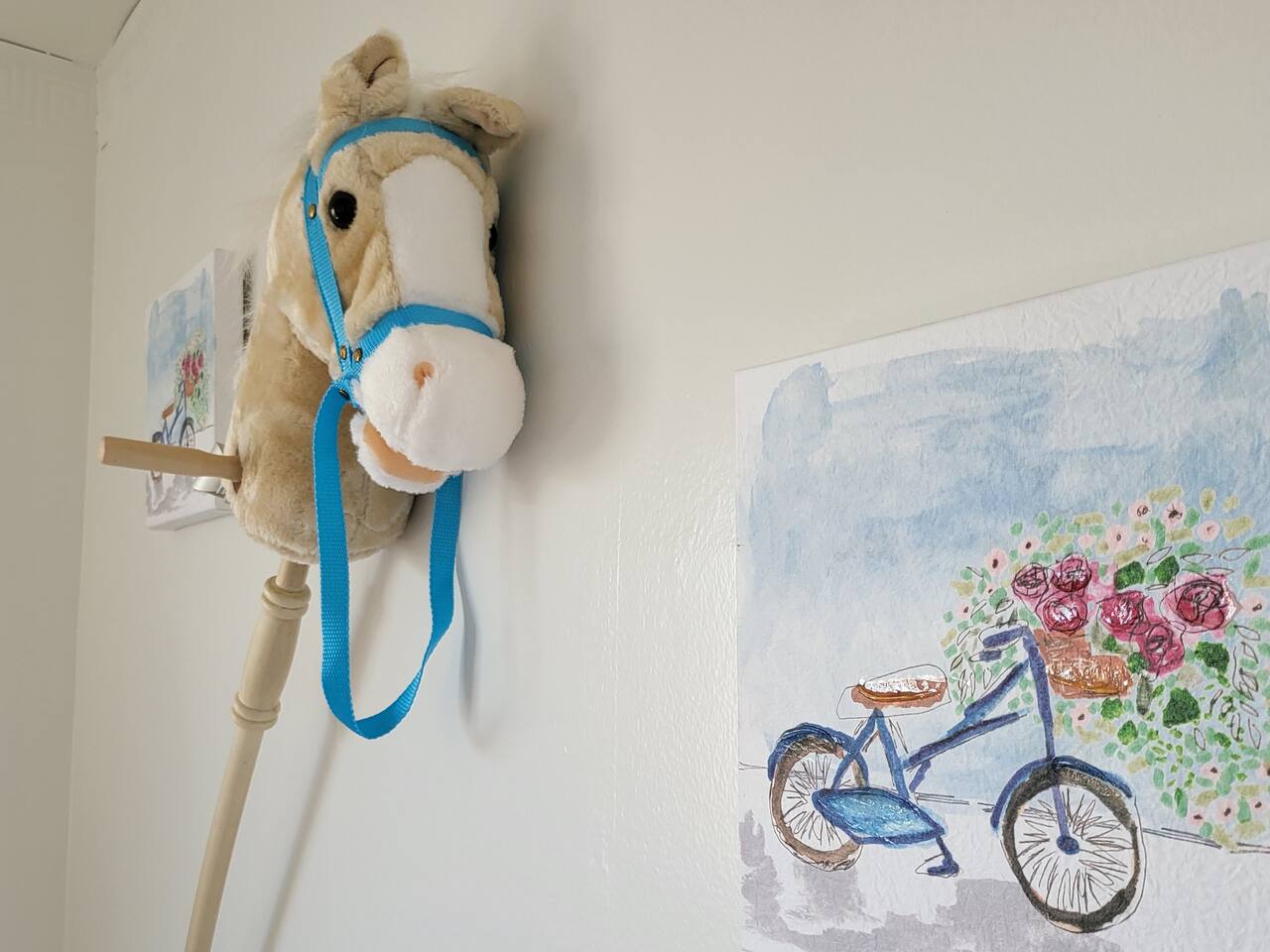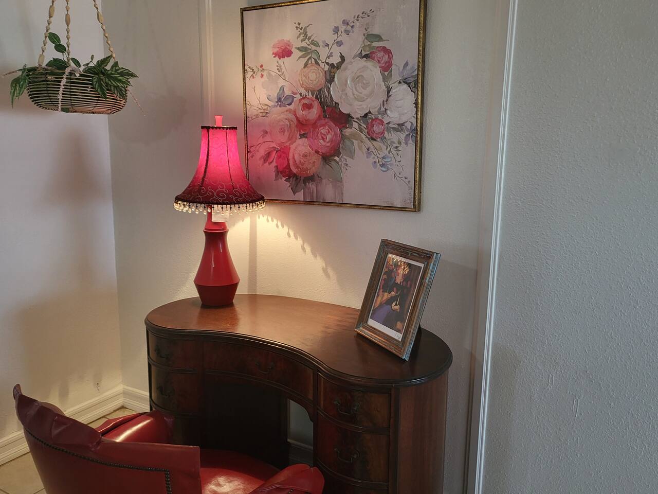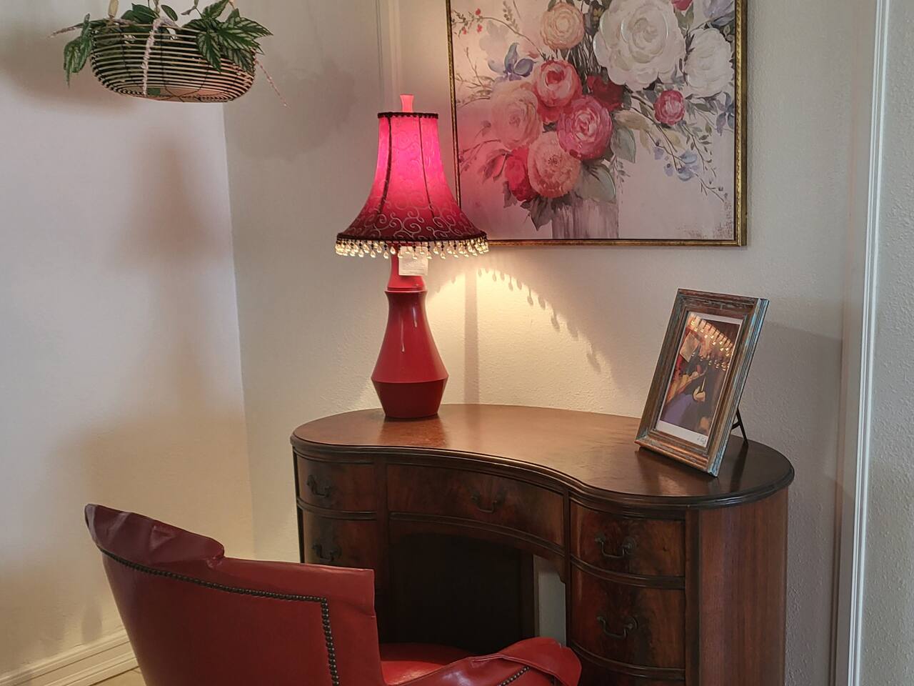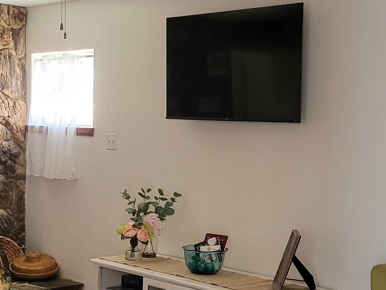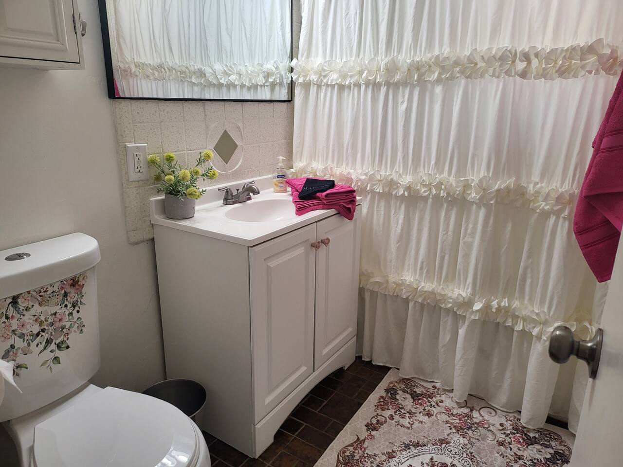 This cute shabby chic apartment has two bedrooms and sleeps 5 comfortably. Bedroom One has a king bed, blackout curtains, a smart TV, dresser, and bedside tables with lamps. The lamps have charging ports for your electronics so you do not have to hunt for an outlet. Bedroom two has two twin beds, Blackout curtains, a Smart TV, dresser, and kids toys. You will find a smart TV, comfy couch, desk with lamp and chair in the living room. The kitchen is fully equipped and the coffee and tea are free.