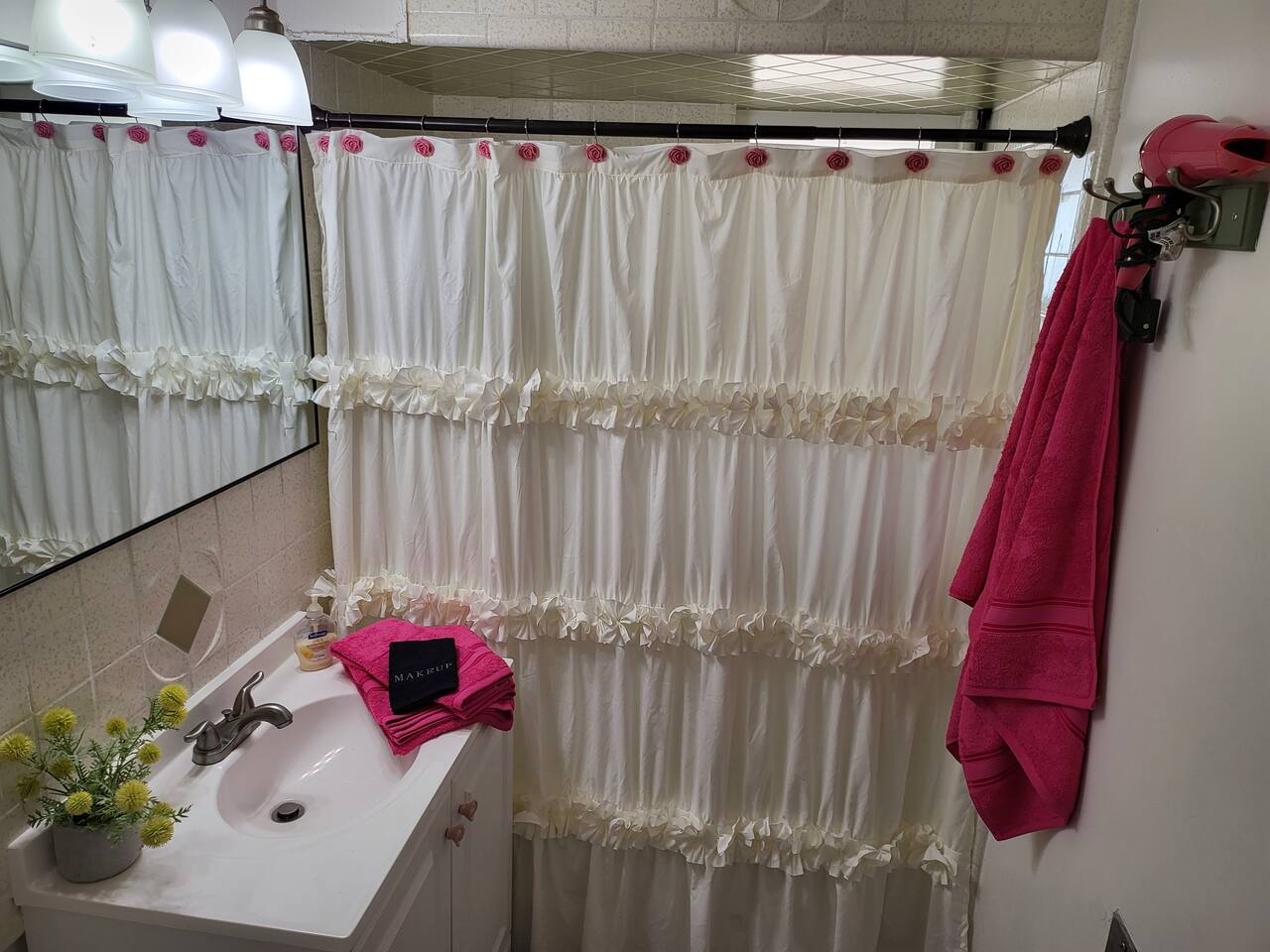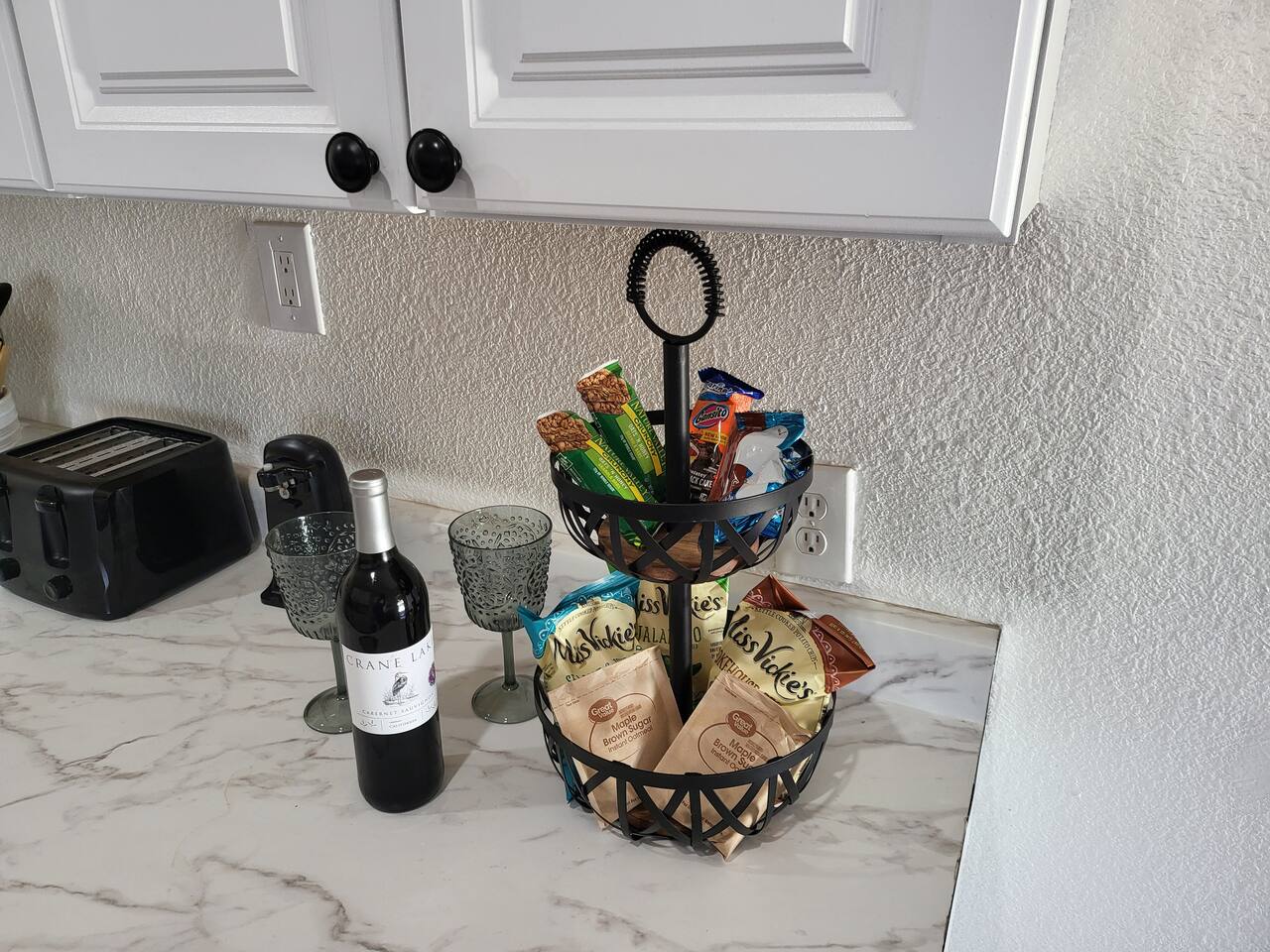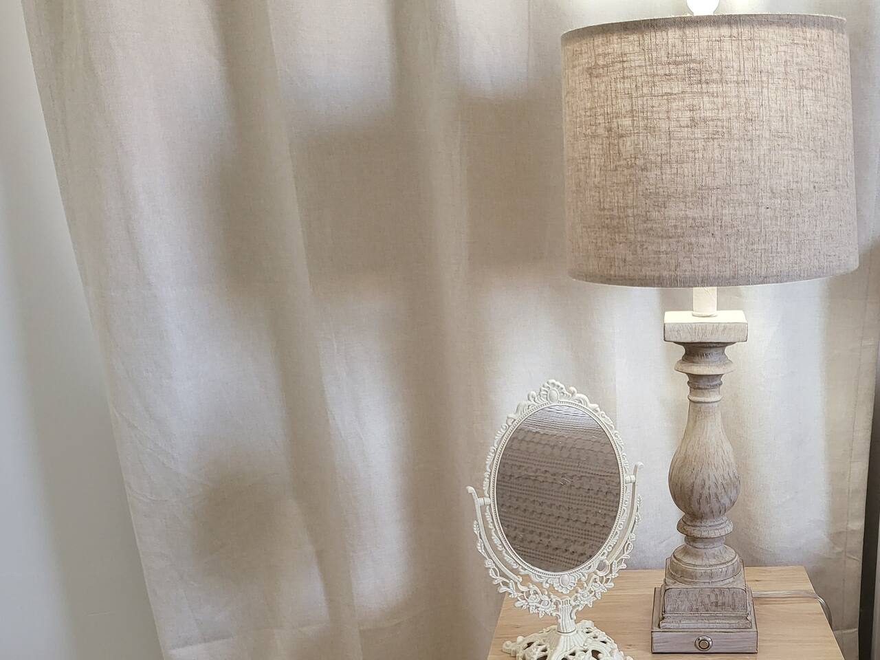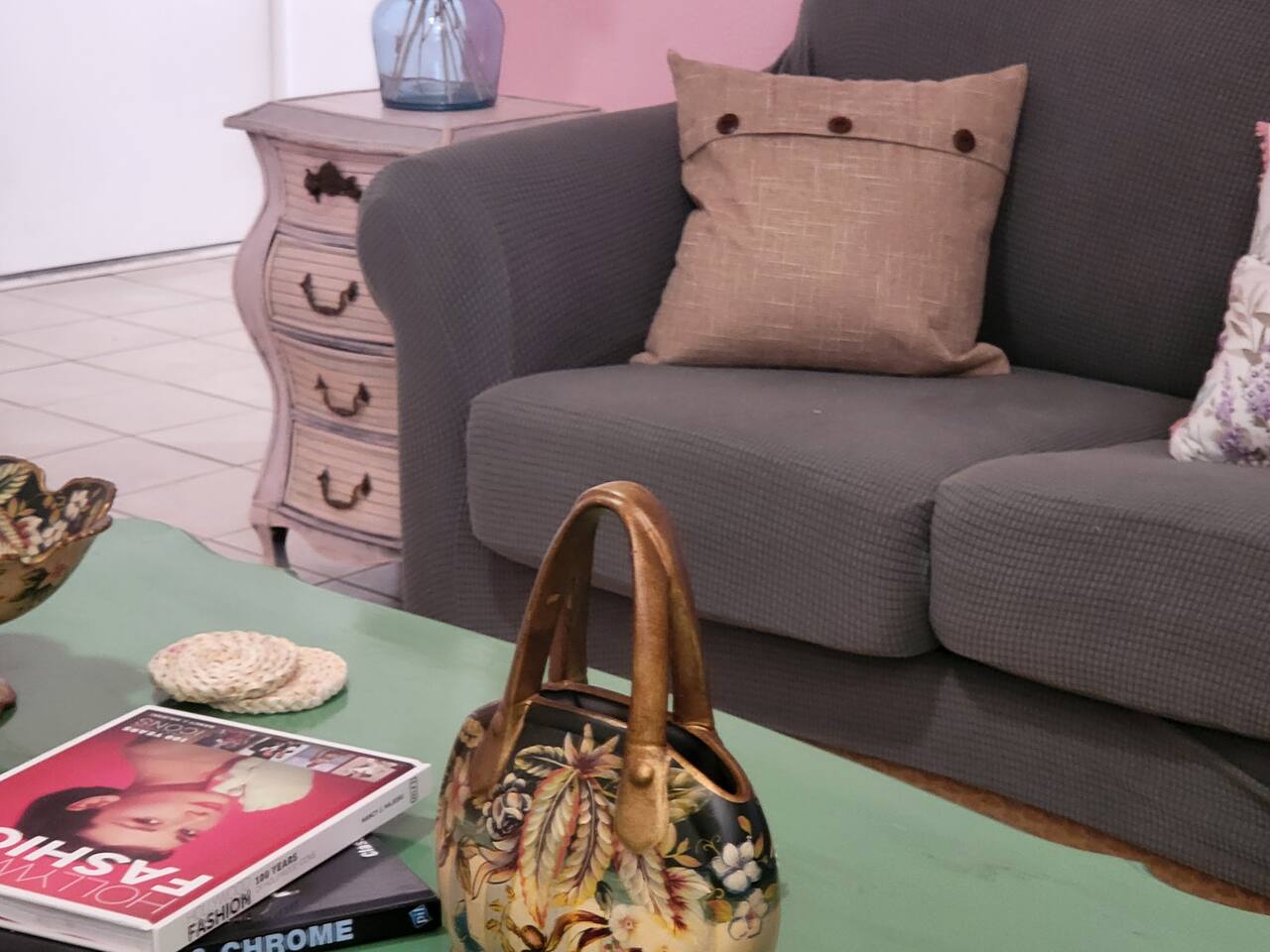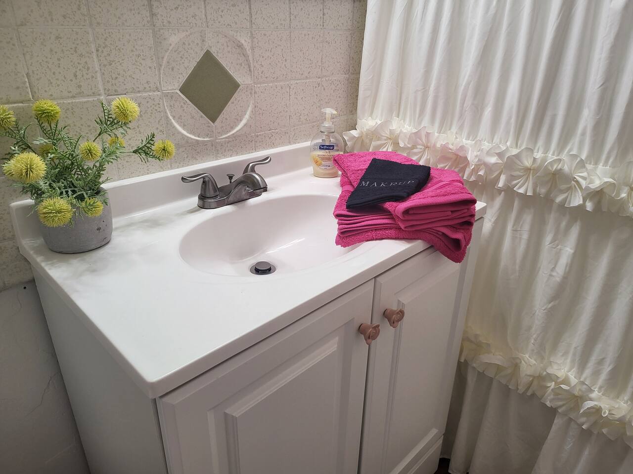 This cute shabby chic apartment has two bedrooms and sleeps 5 comfortably. Bedroom One has a king bed, blackout curtains, a smart TV, dresser, and bedside tables with lamps. The lamps have charging ports for your electronics so you do not have to hunt for an outlet. Bedroom two has two twin beds, Blackout curtains, a Smart TV, dresser, and kids toys. You will find a smart TV, comfy couch, desk with lamp and chair in the living room. The kitchen is fully equipped and the coffee and tea are free.