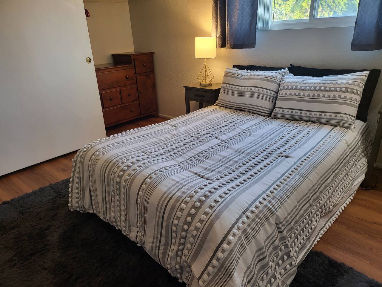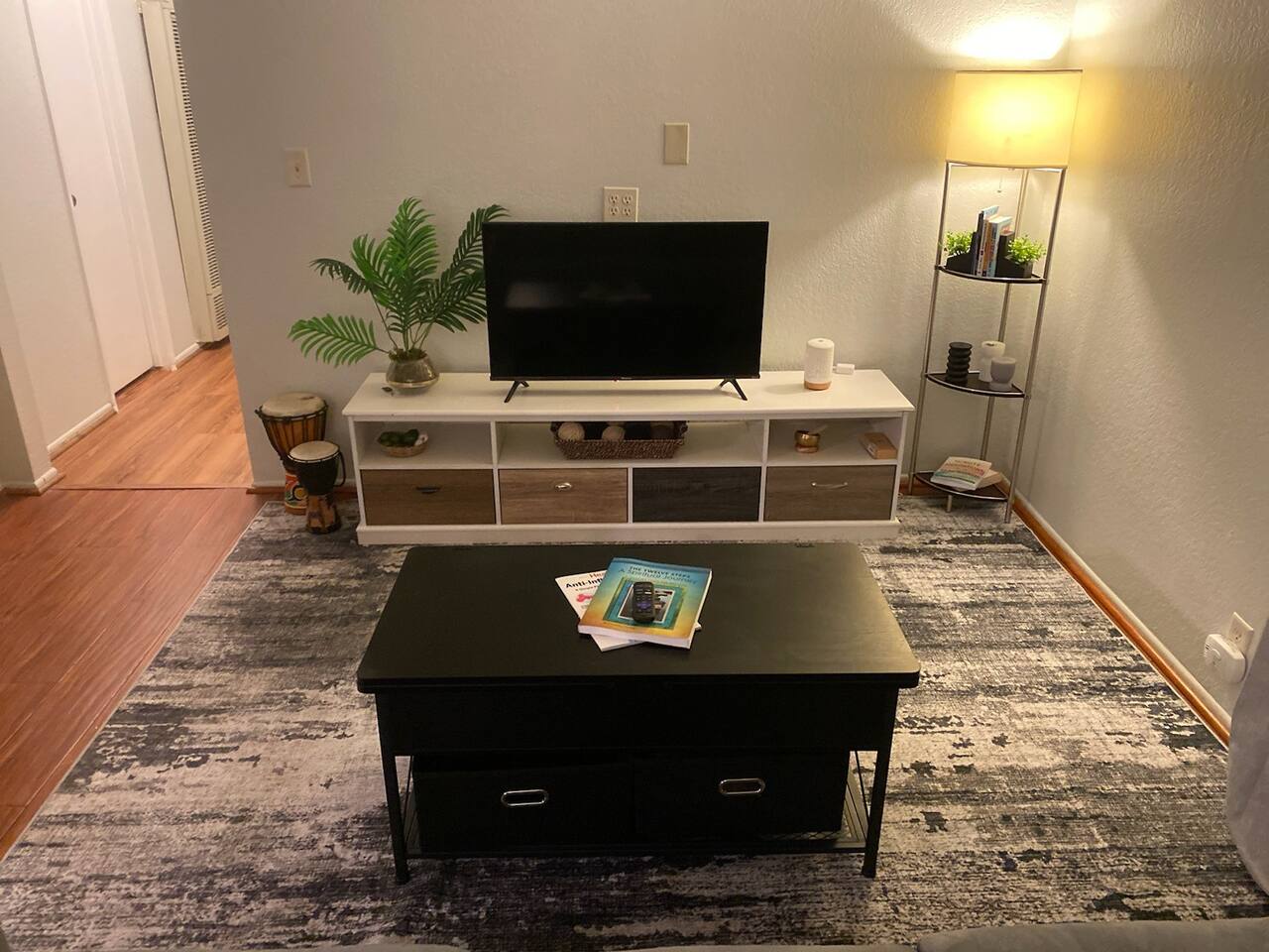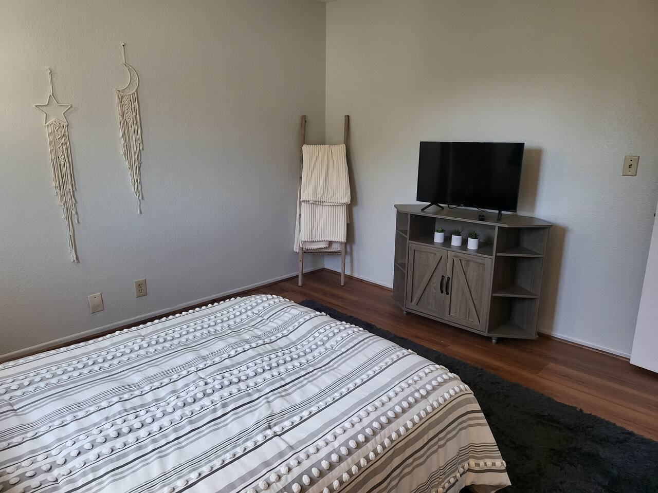 This two-bedroom, two-bathroom condo is located on the second floor. The primary bedroom features a queen bed and a private bathroom with a walk-in shower. This room includes a dresser, a large closet, and two nightstands equipped with standard and USB charging ports for convenient bedside charging. Additionally, it has a smart TV. The second bedroom contains a full bed, along with charging ports located on the left side of the bed frame for electronic devices. This room also comes with a smart TV and a TV stand that holds board games and puzzles. The lamp in this room has a built-in USB charging port as well. The living room features a queen sofa bed, a smart TV, and a gas fireplace. A lift-up coffee table can also be used as a dedicated workspace, dining table, or laptop table. It can also be extended to accommodate four people, making it perfect for game nights or extra dining. In the hallway, you will find towels and extra sheets, and blankets. The dining area features a large table with five chairs. The kitchen is well equipped with a toaster, coffee maker, electric can opener, electric hot water kettle, dishwasher, stove, microwave, and refrigerator. Overall, this space is thoughtfully designed and set up for a very comfortable stay.